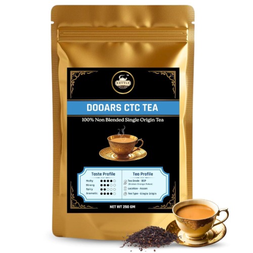 Enjoy a bold and malty cup of CTC tea, perfect for making chai or milk tea. This tea blends smoothly with milk and sugar, creating a rich and comforting beverage enjoyed in many homes worldwide. Our tea leaves are carefully selected from renowned tea gardens in the Dooars region, known for their fertile soil and unique climate. These conditions produce tea with a distinctive, full-bodied flavor. CTC black tea is naturally rich in antioxidants, which help protect the body from oxidative stress and support overall health. Add this flavorful tea to your daily routine for a delicious and revitalizing experience.