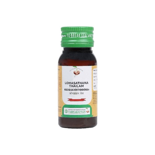 Lomasathana Thailam is a specialized Ayurvedic oil designed to manage unwanted hair growth. Enriched with a unique blend of herbal and mineral ingredients, this oil targets hair follicles to reduce excessive hair growth and promotes healthy skin.