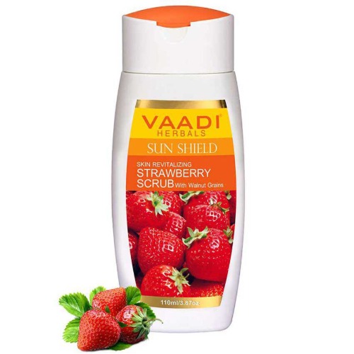 A natural strawberry scrub lotion that gently removes dead skin cells, hydrates, and protects your skin from UV damage for a glowing look.